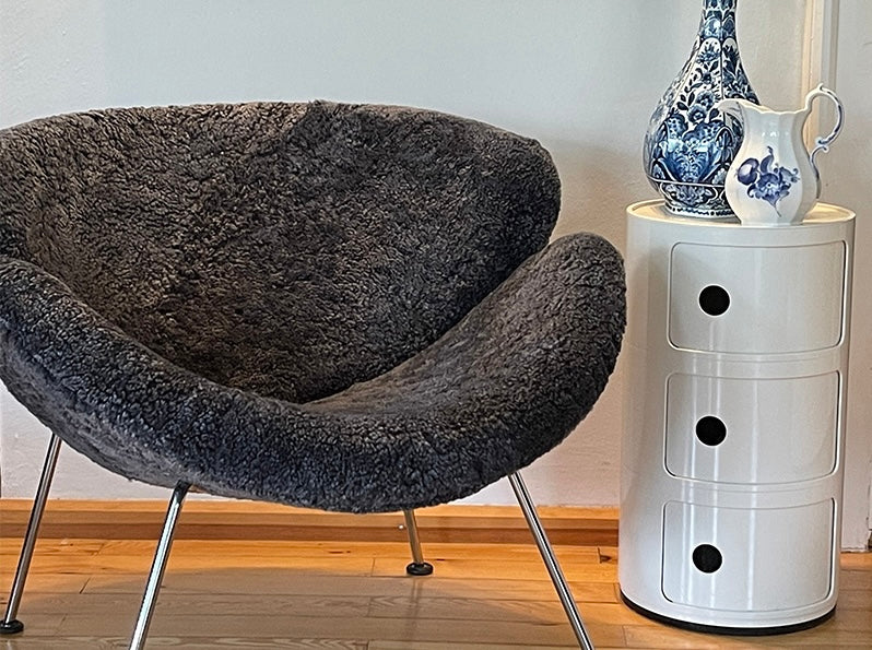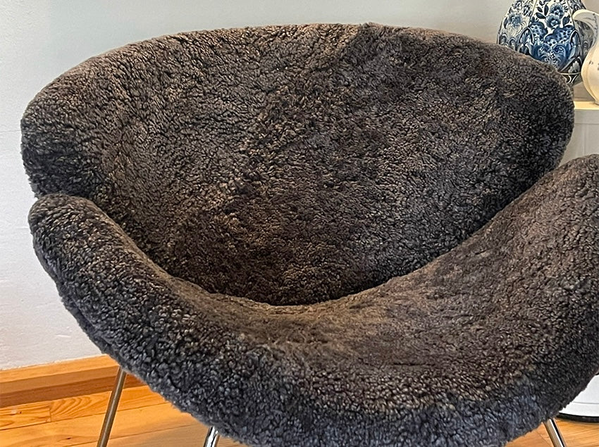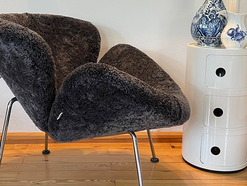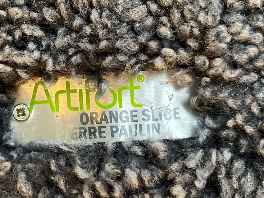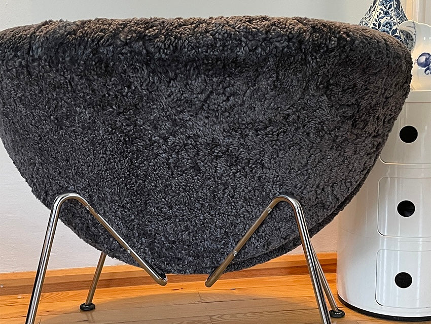 Der Orange Slice Chair von Artifort, entworfen von Pierre Paulin, ist ein ikonischer Designklassiker. Dieses Original-Vintage-Modell wurde von uns hochwertig und fest mit curly Schaffell in Anthrazit/Charcoal neu bezogen, was ihm eine moderne, elegante Ausstrahlung verleiht.